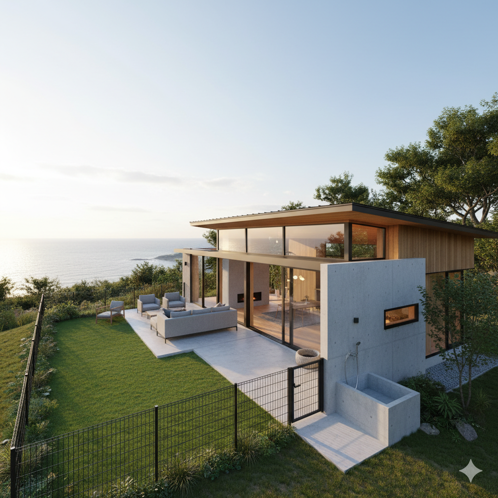 海沿いは溶融亜鉛めっきや樹脂被膜のメッシュフェンス、耐塩害の金物、遮熱人工芝が適します。内陸は砕石下地+透水平板+人工芝の組み合わせがメンテを軽減します。