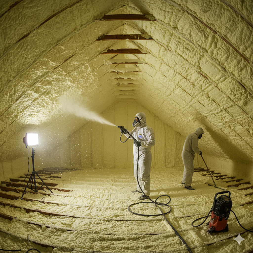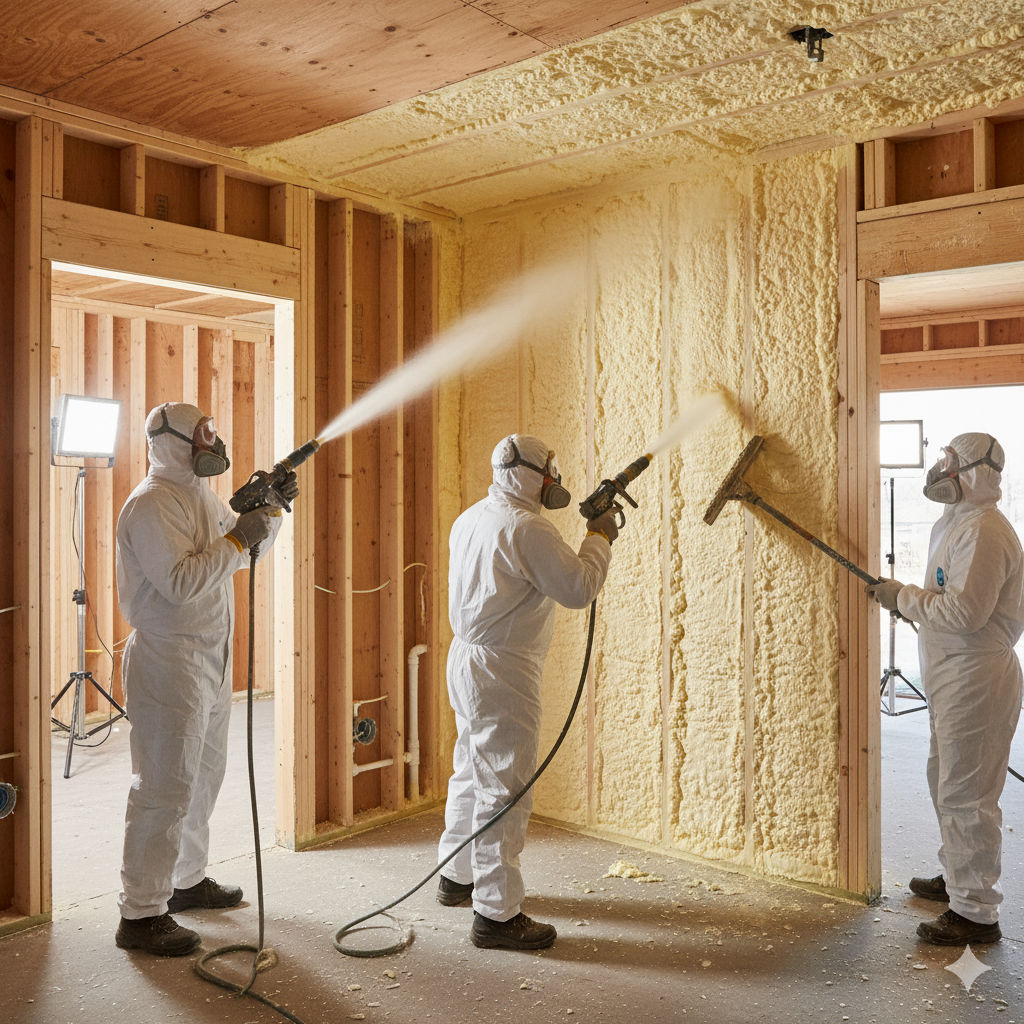 搬入は原液のみ、発泡で体積化するため足場や搬送の負担が小さめ。木造戸建の壁・天井なら1〜2日程度で段取りできる現場が多いです(条件で変動)。