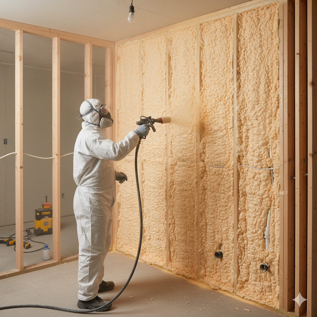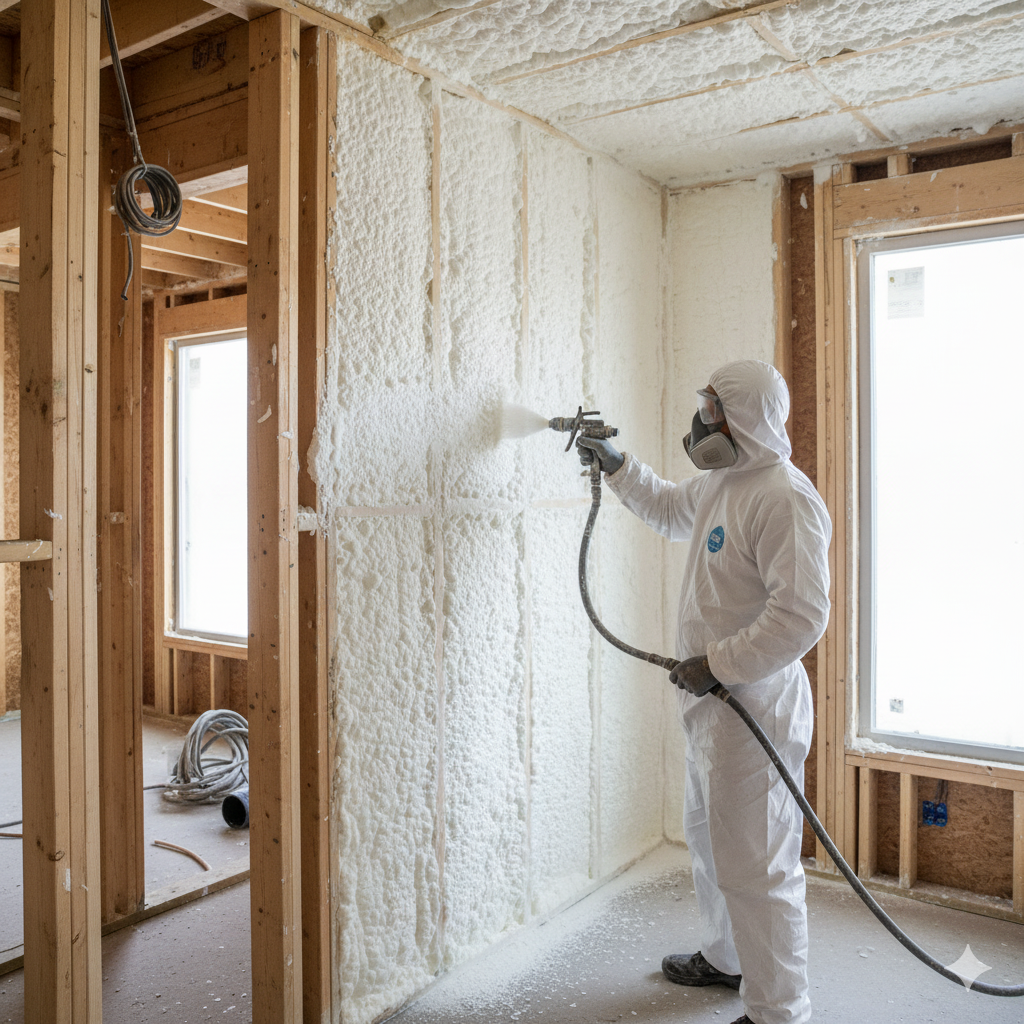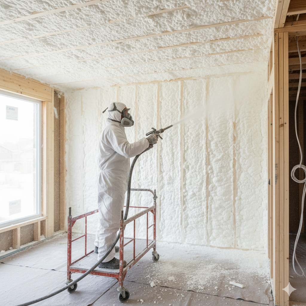 【結論】現場で原液を混合・発泡させて連続した断熱層を形成する工法。材料は JIS A 9526 により品質・熱伝導率(例:0.026〜0.040W/mKの区分)が規定。最終的な性能目標は、外皮性能など建築物省エネ法の基準達成で判断します。(主要サブKW:吹付断熱材
