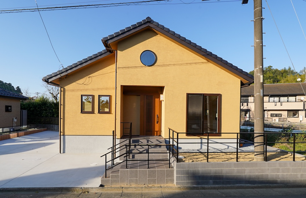 切妻屋根が美しい外観デザインに仕上げられ、さらにロフト部分に設けた丸窓がアクセントとなり、個性を感じさせる佇まいになっています。