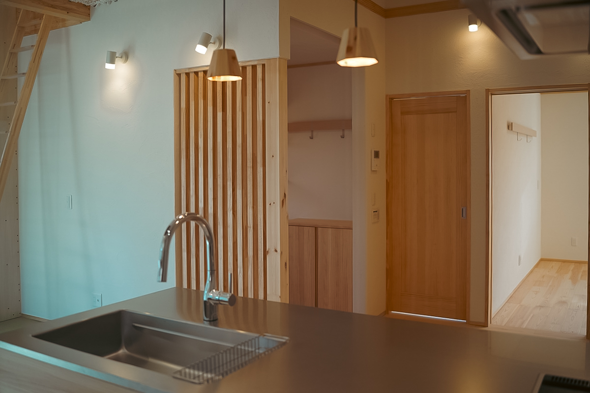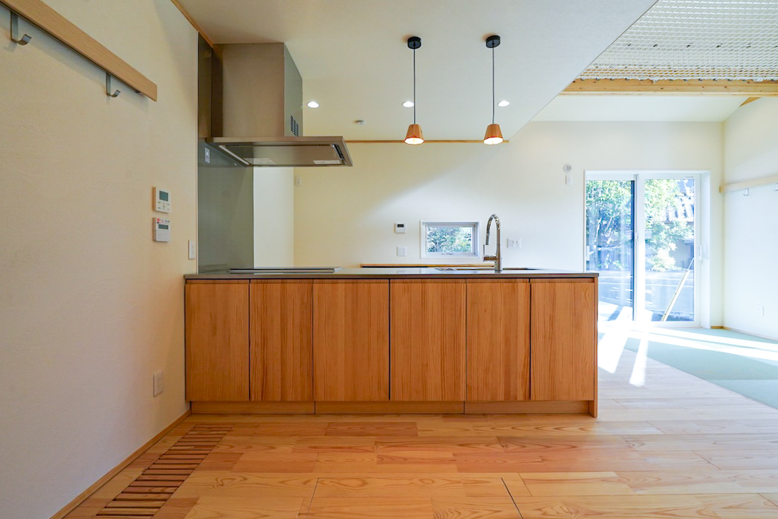 1階全体に床暖房・床冷房を標準装備し、天然木のフローリングや漆喰塗り壁といった自然素材の仕上げで、心地よさと安心に包まれる暮らしを実現しました。