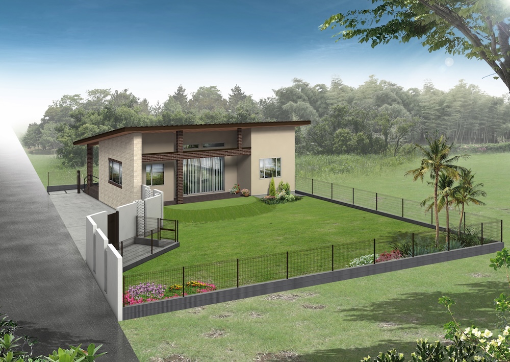 二重扉の門構えで愛犬の飛び出しを防止し、安全にも配慮。約60坪の広々とした芝生の上で、家族と愛犬がのびのびと遊べる理想の住まいです。