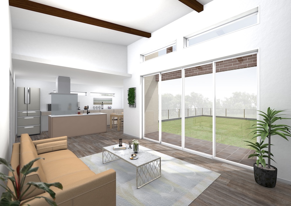 吹き抜けのリビングとつながるアイランドキッチンは、家族の会話が自然に生まれる開放的な空間に。光と風が心地よく通り抜け、毎日の料理時間も楽しくなります。